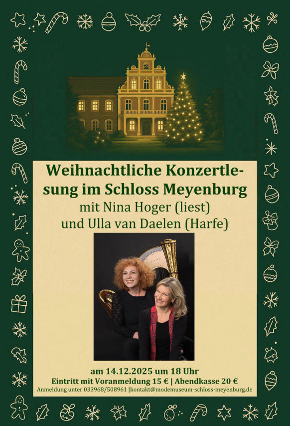 am 14.12.2025 um 18 Uhr veranstalten Nina Hoger und Ulla van Daelen bei uns im Schloss eine weihnachtliche Konzertlesung